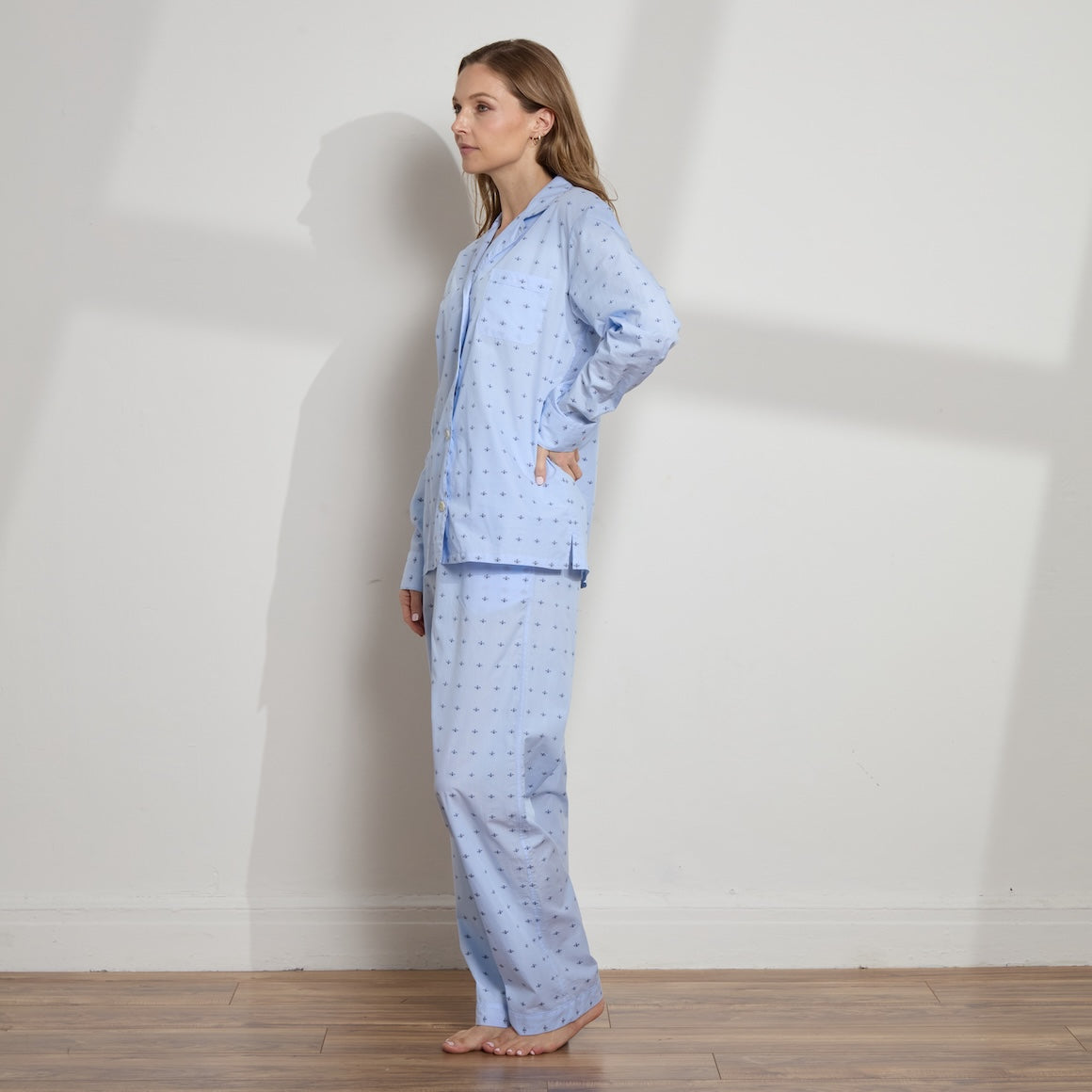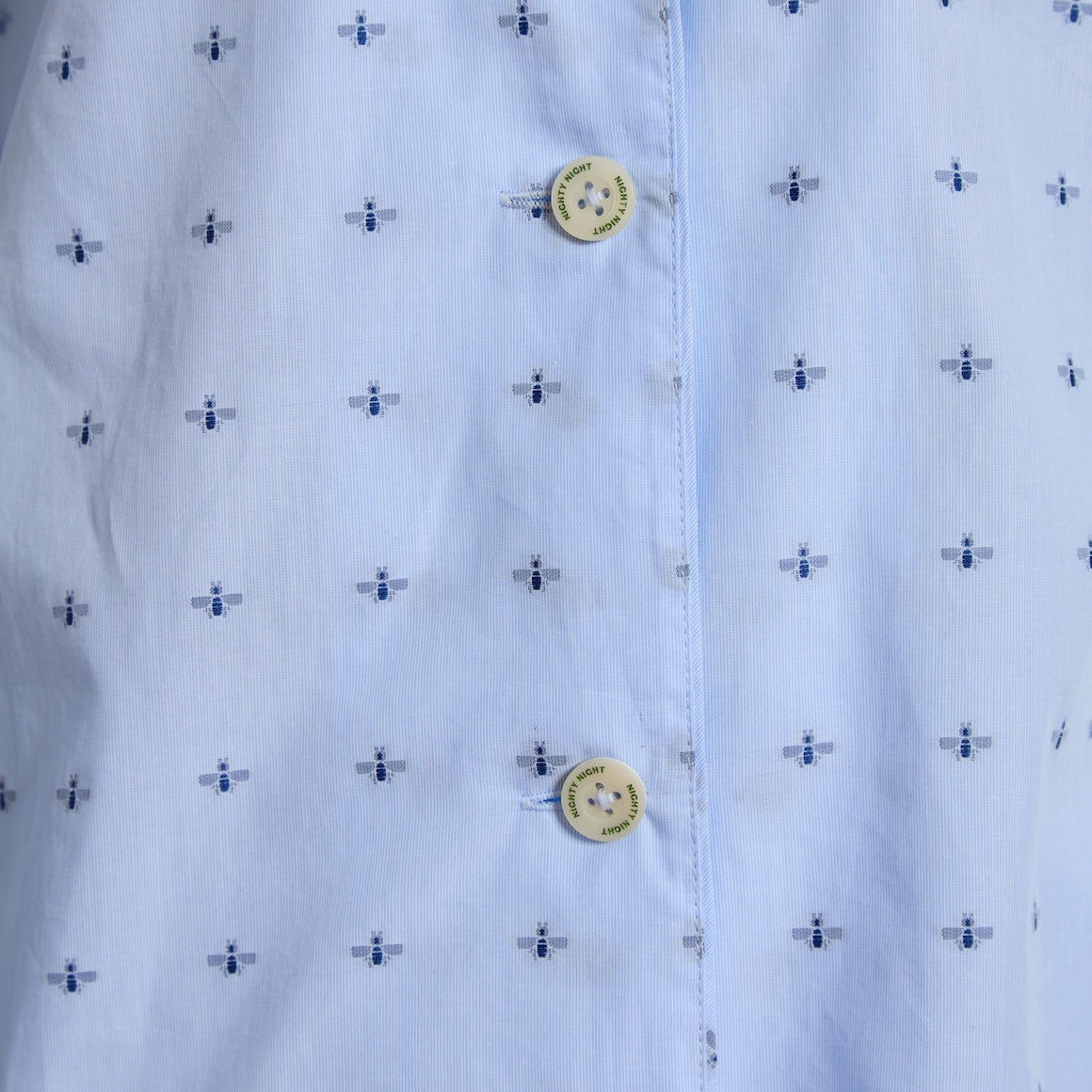 Embroidered navy and white bees add a touch of whimsical sophistication to the light blue fabric, creating a sleepwear set that feels as tailored as it is comfortable. From the gentle drape of the fabric to the carefully finished cuffs, this set is a quiet invitation to slow down and indulge in the ritual of rest.