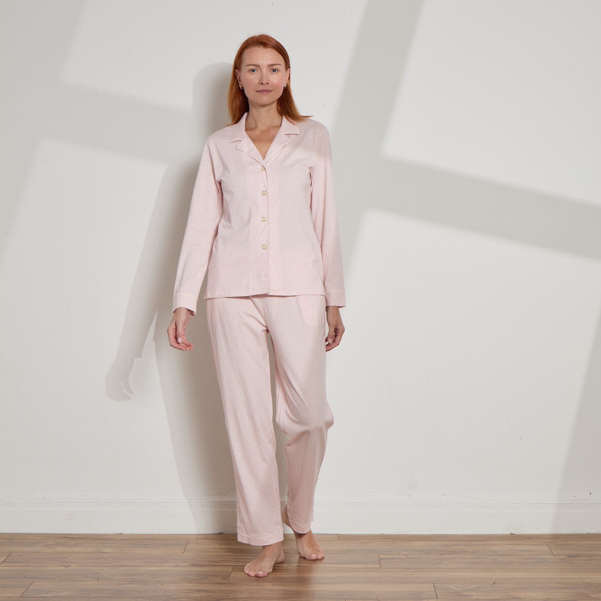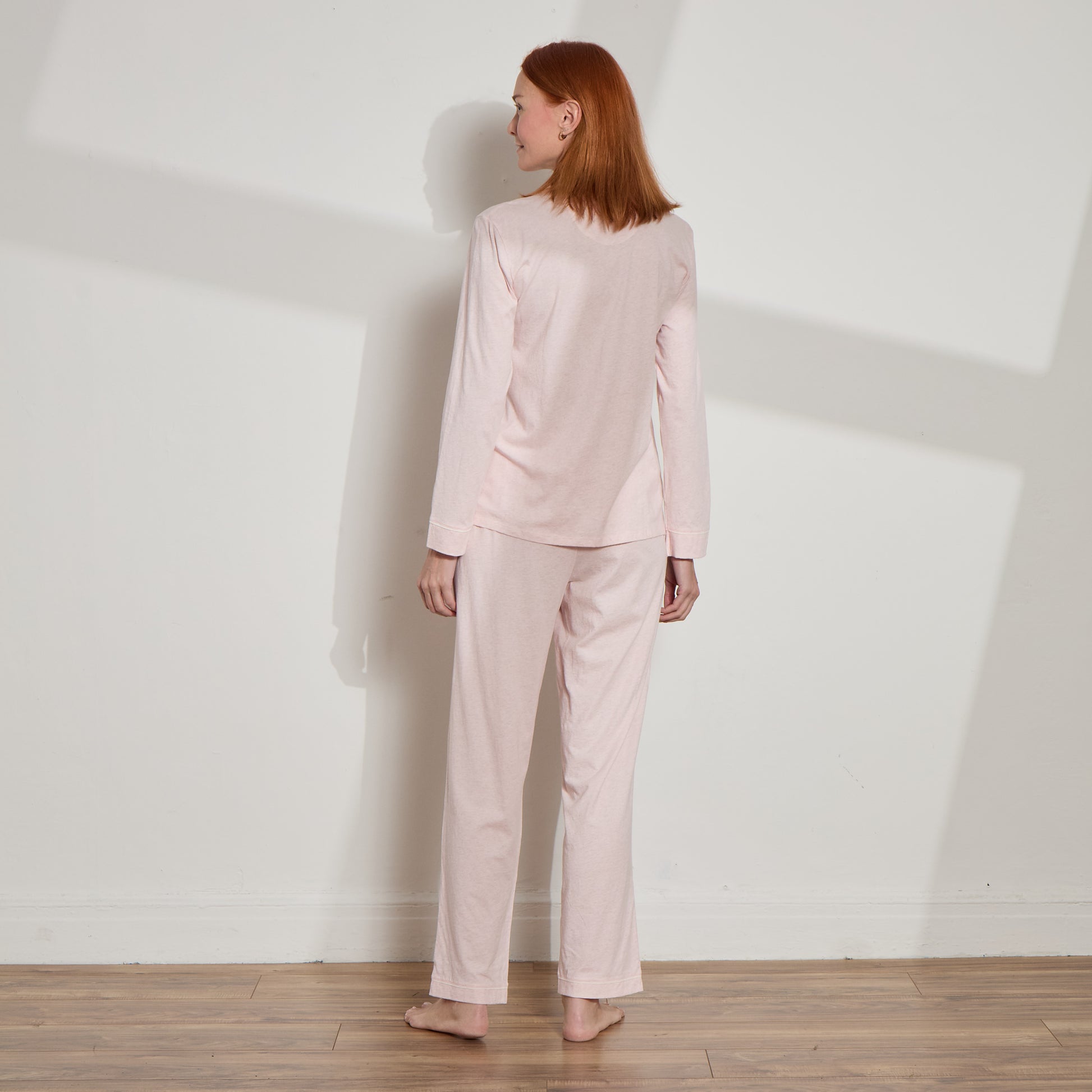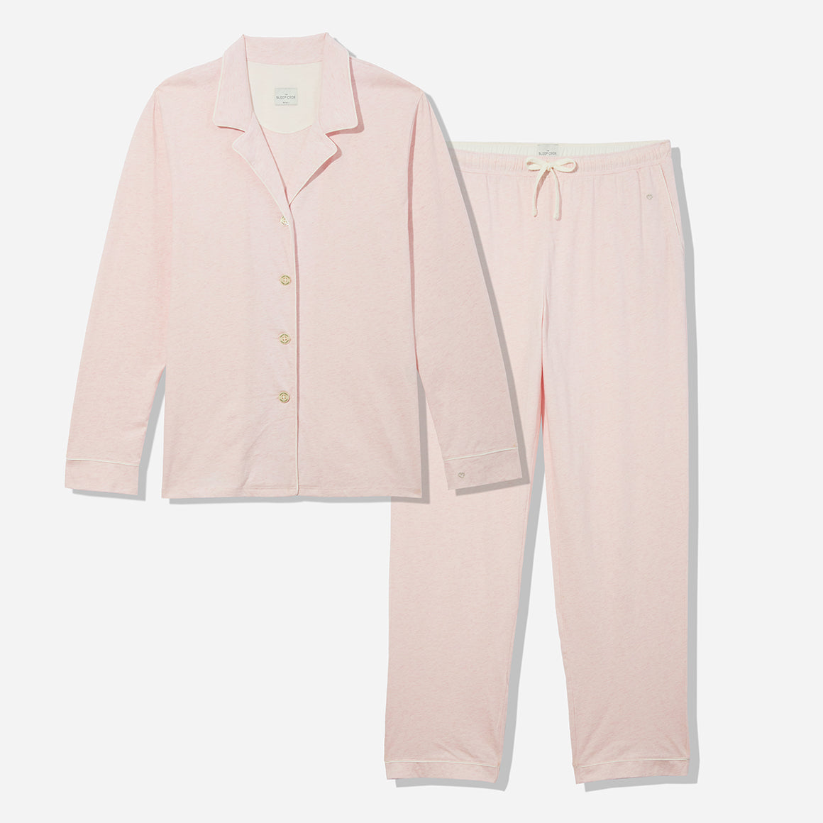 Our long-sleeve pajama set features a classic button-up top and relaxed-fit pants with an adjustable drawstring waist. Perfect for slow mornings, cozy nights, and everything in between. Slip in and let comfort take it from here.