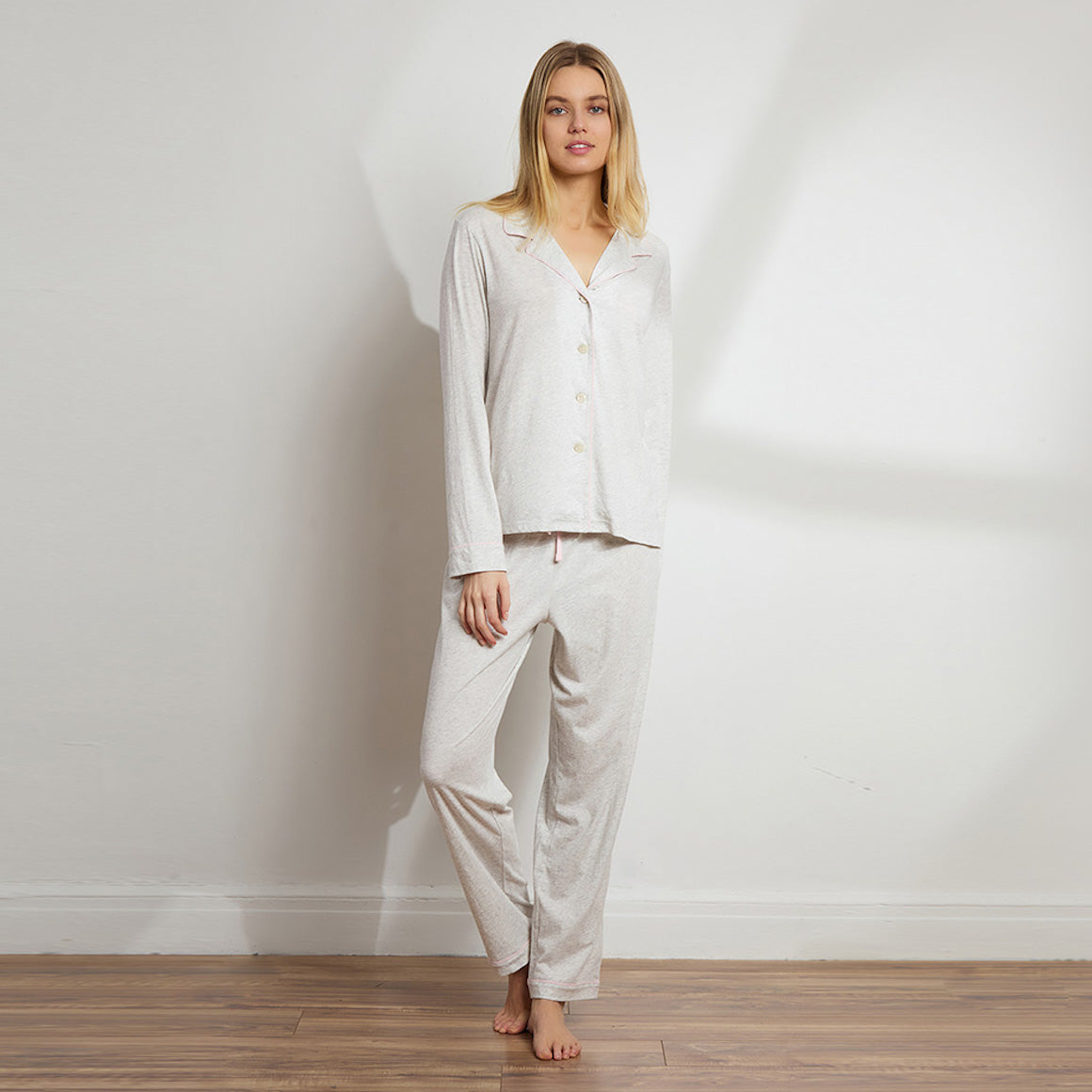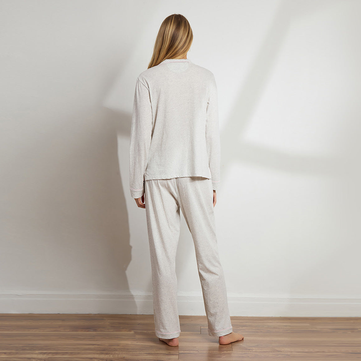 Our long-sleeve pajama set features a classic button-up top and relaxed-fit pants with an adjustable drawstring waist. Perfect for slow mornings, cozy nights, and everything in between. Slip in and let comfort take it from here.