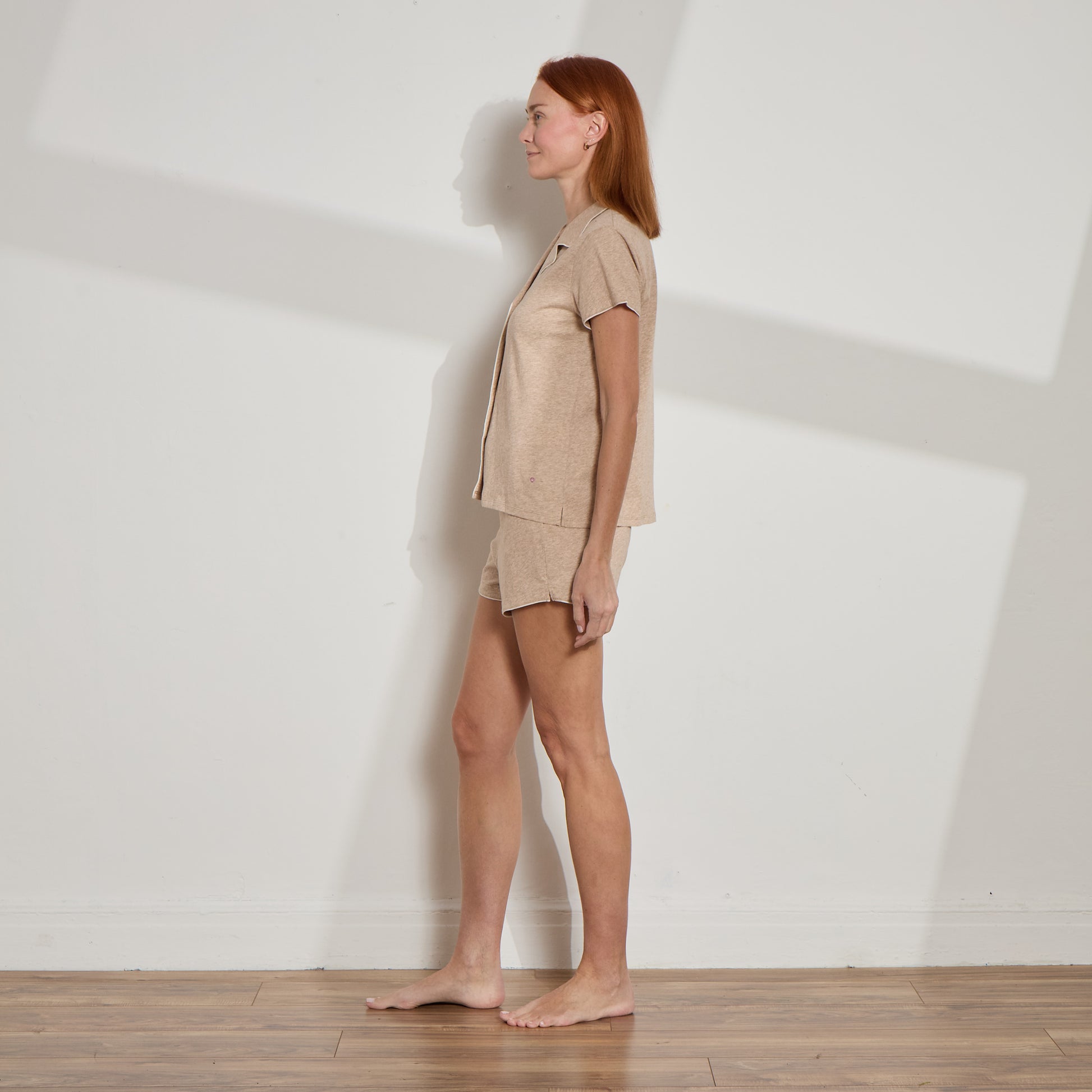 Our short sleeve pajama set features a classic button-up short sleeve top and relaxed-fit shorts with an adjustable drawstring waist—perfect for warm nights, lazy mornings, and everything in between. Slip in and let comfort take it from here.