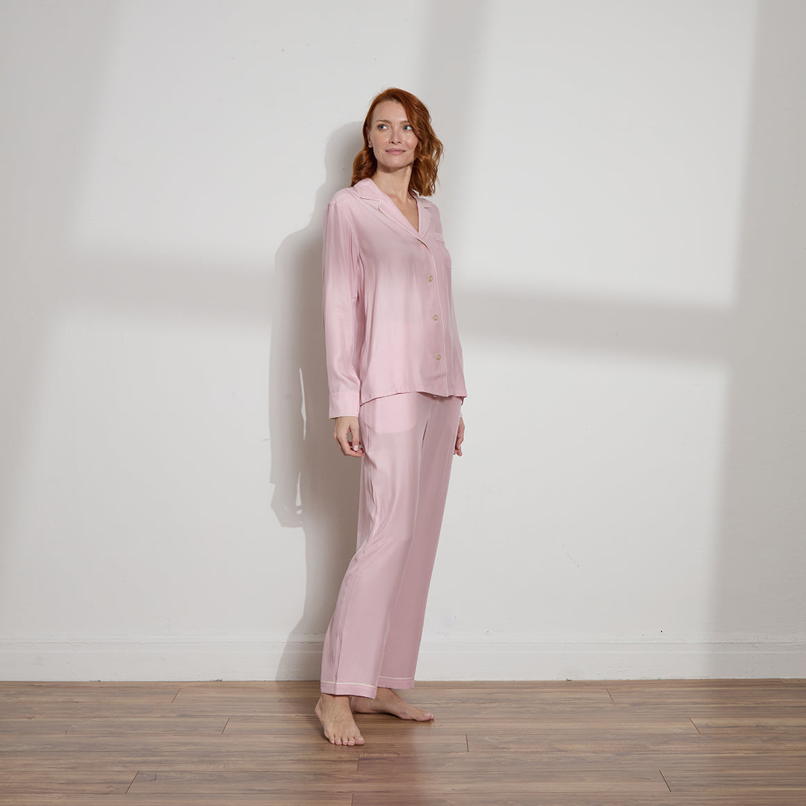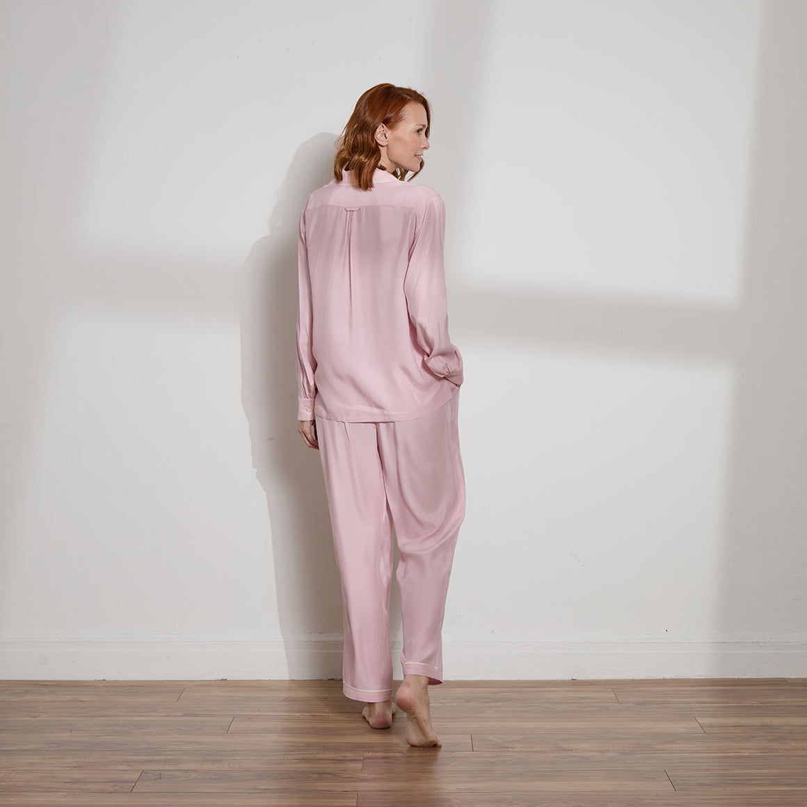 Indulge in luxurious comfort with our women's silk long sleeve pajamas. Made from 100% pure mulberry silk, these pajamas are the epitome of elegance and sophistication. The natural silk charmeuse has a matte finish and the soft drape of the silk fabric creates a dreamy, lightweight feel against your skin. The natural properties of silk help regulate body temperature, keeping you cool in the summer and warm in the winter.