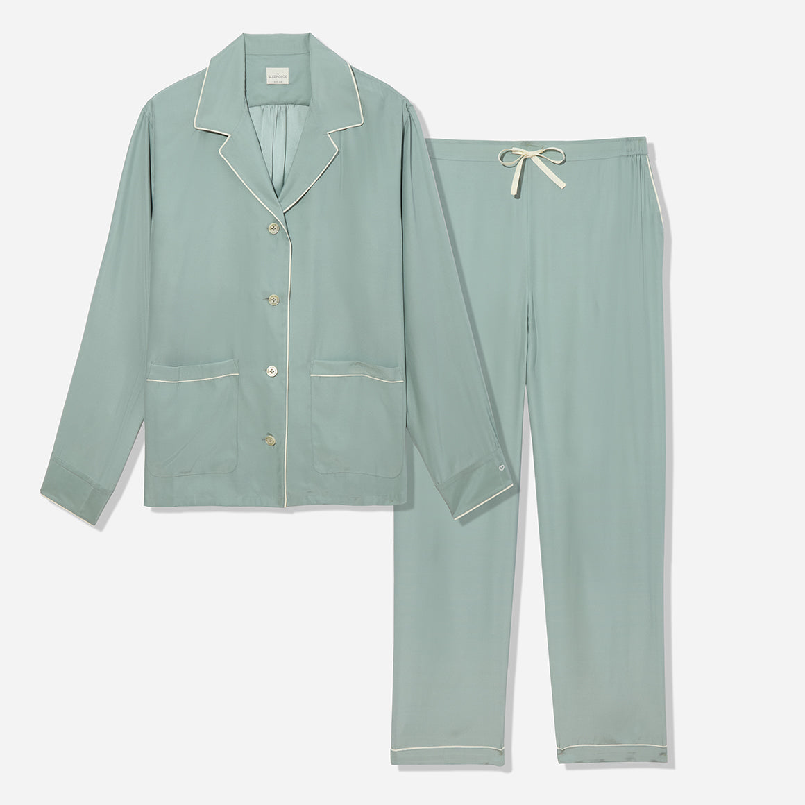 • Sage; long sleeve, classic button-up top with a collar and pants
